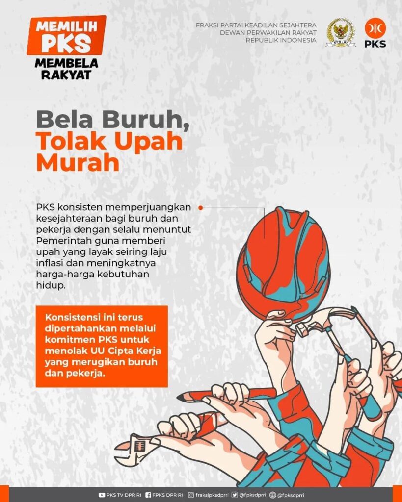 PKS konsisten memperjuangkan kesejahteraan bagi buruh dan pekerja dengan selalu menuntut Pemerintah guna memberi upah yang layak seiring laju inflasi dan meningkatnya harga-harga kebutuhan hidup. Konsistensi ini terus dipertahankan melalui komitmen PKS untuk menolak UU Cipta Kerja yang merugikan buruh dan pekerja.
