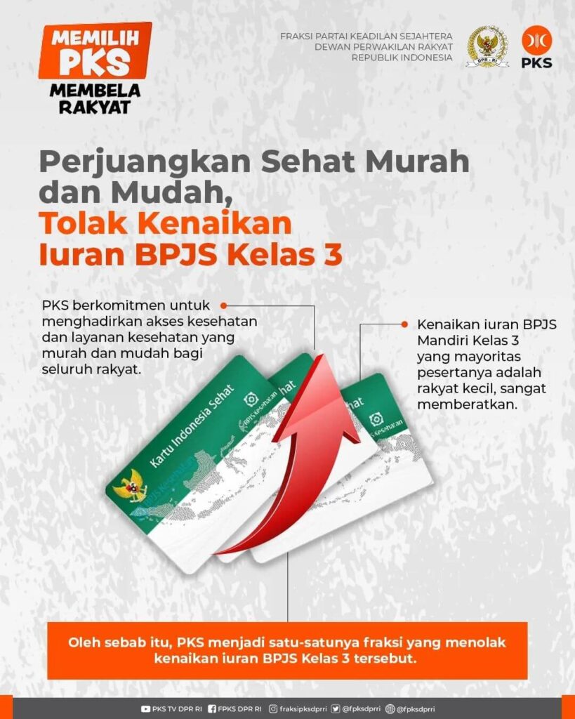 PKS berkomitmen untuk menghadirkan akses kesehatan dan layanan kesehatan yang murah dan mudah bagi seluruh rakyat. Kenaikan iuran BPJS Mandiri Kelas 3 yang mayoritas pesertanya adalah rakyat kecil, sangat memberatkan. Oleh sebab itu, PKS menjadi satu-satunya fraksi yang menolak kenaikan iuran BPJS Kelas 3 tersebut.
