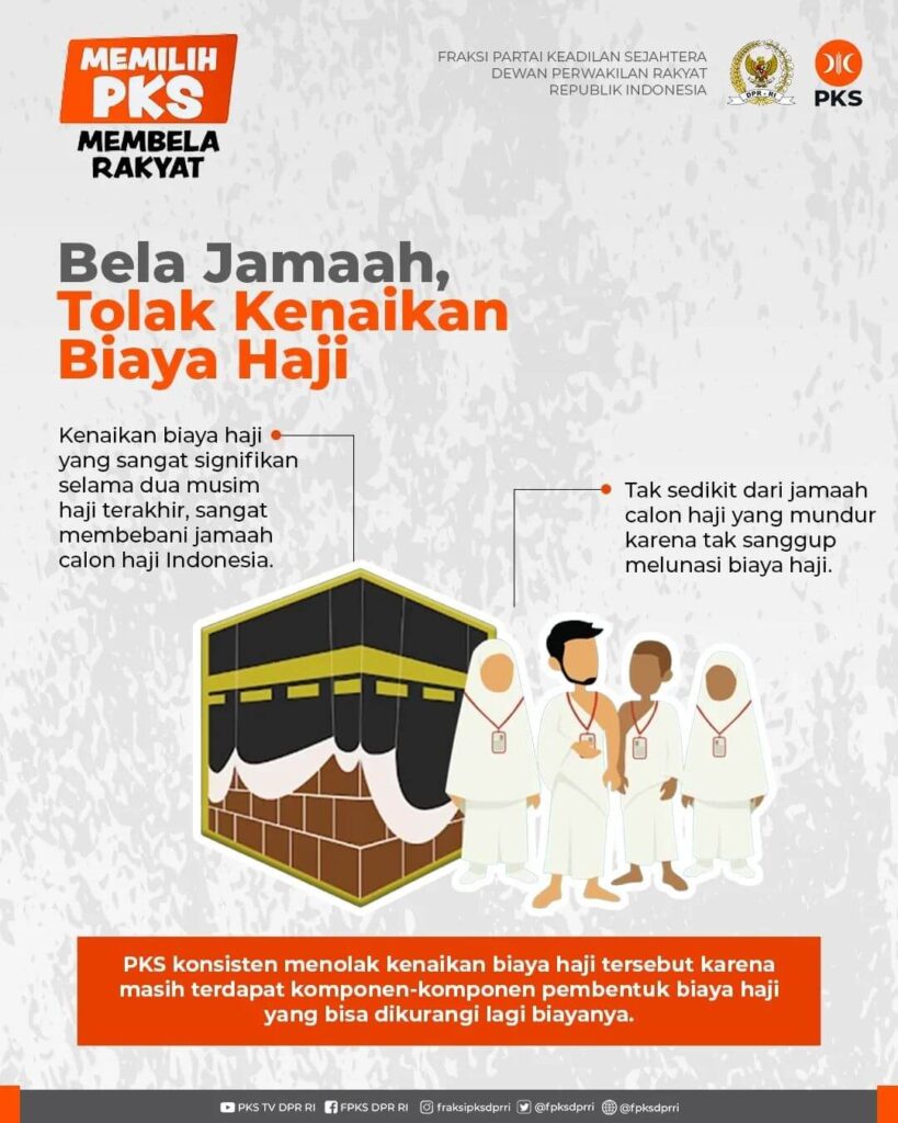 Kenaikan biaya haji yang sangat signifikan selama dua musim haji terakhir, sangat membebani jamaah calon haji Indonesia. Tak sedikit dari jamaah calon haji yang mundur karena tak sanggup melunasi biaya haji. PKS konsisten menolak kenaikan biaya haji tersebut karena masih terdapat komponen-komponen pembentuk biaya haji yang bisa dikurangi lagi biayanya.